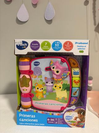 Nuevo. Fue un regalo de Navidad pero ya lo tenemos. Libro interactivo de VTech para bebés, con el título Primeras canciones. - Incluye 7 páginas interactivas. - Más de 50 combinaciones de sonidos, palabras y frases. - 2 modos de juego: aprendizaje y música. - Edad recomendada: 6-36 meses.