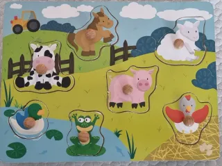 Conjunto de siete puzzles de madera con divertidos diseños infantiles. - Puzzle de animales de granja. - Puzzle de números del 0 al 9. - Puzzle de vehículos. - Puzzle de excavadora. - Puzzle de oso panda. - Puzzle de coche de policía. - Puzzle de cuaderno y material escolar. Usados pero muy bien cuidados. Ideales para bebes y niños hasta 5 años.