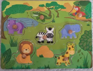 Divertido puzzle de madera con animales de la selva para bebés. - Incluye 7 piezas de animales: león, elefante, cebra, jirafa, hipopótamo, cocodrilo y leopardo. - Piezas gruesas y fáciles de agarrar para manos pequeñas. - Diseño colorido y atractivo. - Base de madera con siluetas de los animales.