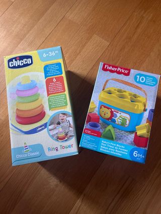 - Torre de anillas Chicco Classic para bebés de 6 a 36 meses. sin estrenar. Incluye 6 anillas de colores para apilar. - Set de 10 bloques de formas de Fisher-Price. Como nuevo. En su caja original. Pack 15€, por separado 8€ cada uno.