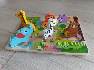Divertido puzzle de madera con temática de animales de la selva, ideal para los más pequeños. - Incluye 8 piezas de animales: jirafa, león, perezoso, oso, elefante, cebra, cocodrilo y pájaro. - Base de madera con siluetas para encajar las piezas. - Diseñado para manos pequeñas, fomenta la motricidad fina y el reconocimiento de animales.
