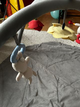 Gimnasio de actividades para bebés de Ikea. Incluye varios juguetes colgantes para estimular el desarrollo. - Colchoneta acolchada de color gris. - Arcos de juego con peluches. - Juguetes de diferentes texturas y formas.