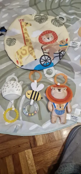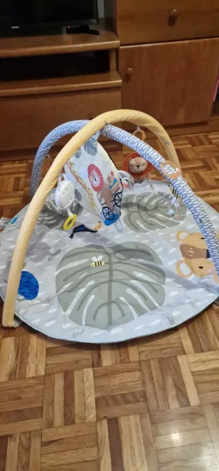 Gimnasio de actividades para bebés, ideal para estimular el desarrollo. - Incluye arco con juguetes colgantes. - Tapete acolchado con diseño de hojas y animales. - Juguetes con diferentes texturas y sonidos.