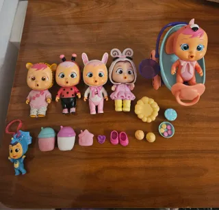 Lote de muñecos Bebés Llorones con accesorios. - Incluye 5 muñecos. - Accesorios variados como biberones, zapatos y un cochecito.