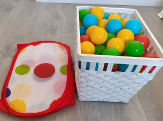 Piscina de bolas de colores para los más pequeños. - Bolas de colores: azul, amarillo, verde y rojo. - Cesta blanca de mimbre para guardar las bolas. - Piscina de juegos con diseño de lunares.