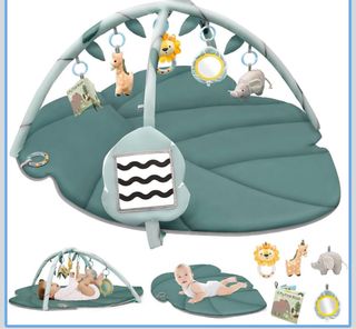 Gimnasio para bebé con diseño de hoja, acolchado y muy divertido. - Incluye varios juguetes colgantes: león, jirafa, elefante, espejo y libro. - Colchoneta suave y cómoda para el bebé. - Estructura de arco para colgar los juguetes.