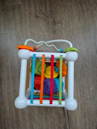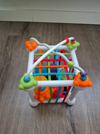 Juguete interactivo con múltiples actividades para bebés. - Estructura triangular con barras naranjas. - Base verde. - Elementos transparentes con cuentas de colores en su interior. - Espejo. - Cilindro con espiral de colores.