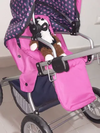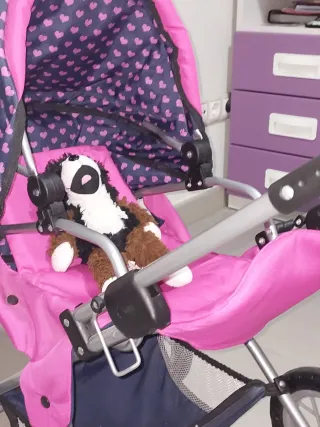 Cochecito de muñecas con un divertido diseño. - Estructura metálica. - Capota con estampado de corazones. - Incluye cesta inferior. - Cuna - Mochila porta bebés