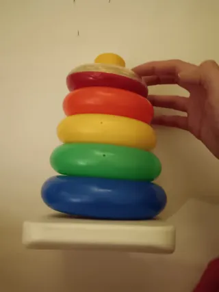 Juguete clásico de apilar para bebés, con anillos de colores. - Anillos de plástico. - Colores: azul, verde, amarillo, naranja y rojo. - Incluye base y figura superior.
