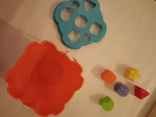 Set de juguetes para bebés, ideal para el desarrollo de habilidades motoras finas y reconocimiento de formas. - Incluye un cubo con diferentes formas para encajar. - Piezas de colores variados: naranja, amarillo, morado, verde y rojo. - Un clasificador de formas azul con múltiples ranuras. - El cubo es de color naranja con un diseño ondulado.