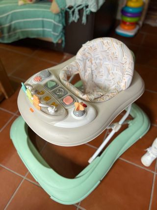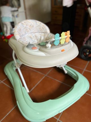 Andador para bebés con asiento acolchado y bandeja de actividades. - Asiento con estampado de hojas. - Bandeja con juguetes. - Base ancha para mayor estabilidad.