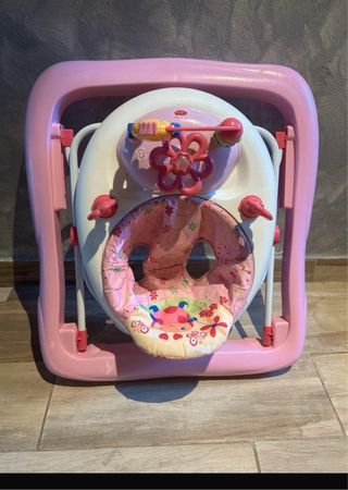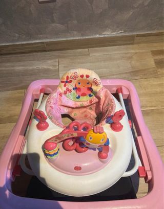 Andador para bebés en color rosa, con detalles y juguetes integrados. - Estructura principal en color rosa. - Asiento acolchado con estampado floral. - Juguetes interactivos en la parte superior.