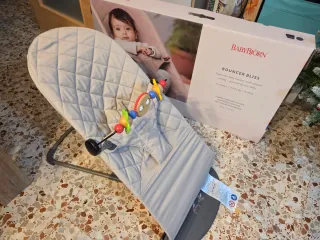 Hamaca ergonómica BabyBjörn Bouncer Bliss, ideal para bebés. - Diseño moderno y acolchado. - Color gris suave. - Incluye juguete. - Plegable y fácil de transportar.
