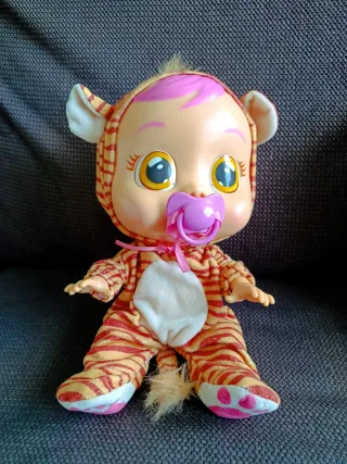 Muñeco bebé llorón con disfraz de tigre. - Disfraz de tigre con capucha y orejas. - Detalles de rayas naranjas y amarillas. - Incluye chupete rosa.