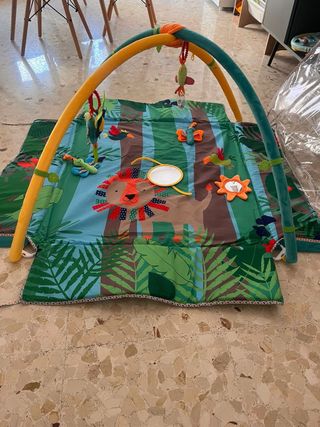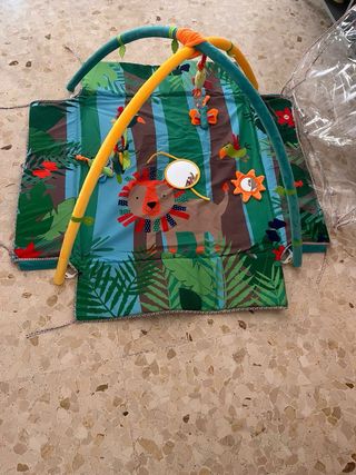 Manta gimnasio de actividades con un diseño de selva y animales. - Incluye arco con juguetes colgantes. - Incluye espejo y sonajero. - Colores vivos y alegres.