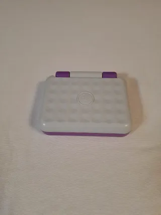Portátil interactivo de Fisher-Price diseñado para bebés y niños pequeños. Fomenta el aprendizaje temprano a través de juegos. - Pantalla con iconos de aplicaciones y un personaje. - Botones con números, letras y símbolos. - Diseño plegable en color morado y blanco.