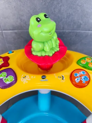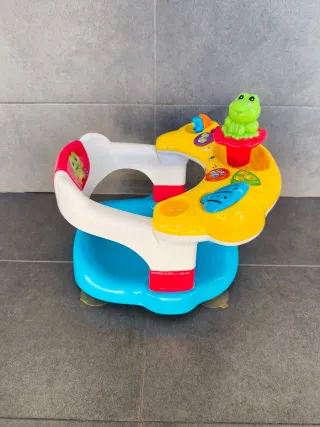 Asiento de baño Aquasilla de Vtech para bebés. Ideal para que los más pequeños disfruten de la hora del baño de forma segura y divertida. - Diseño en colores blanco, amarillo y azul. - Incluye juguetes interactivos aunque debido al uso las pilas no funcionan. - Base con ventosas para mayor estabilidad.