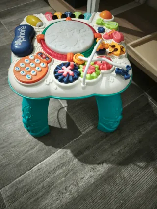 Mesa de actividades musicales para bebés con múltiples juegos. - Piano con teclas de colores. - Tambor central. - Teléfono de juguete con botones. - Elementos giratorios y sonajeros.