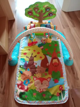 Tapete de actividades para bebés de la marca Fisher-Price con arco de juegos y piano. - Incluye un tapete acolchado con dibujos de animales. - Arco de juegos con colgantes. - Piano interactivo con teclas de colores.