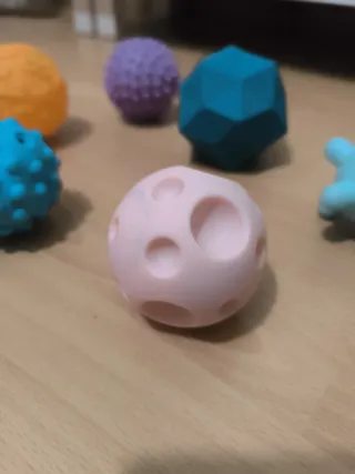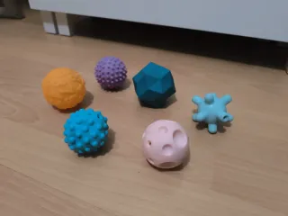 Conjunto de seis pelotas sensoriales de diferentes texturas y formas. - Pelota naranja con relieve. - Pelota morada con pinchos. - Pelota azul con pinchos. - Pelota rosa con hoyuelos. - Pelota azul con forma de estrella. - Figura geométrica verde.