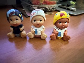 Conjunto de 3 figuras de bebés pelones, típicos de la Roscón de Reyes. Son ideales para coleccionar o decorar. - Figuras de cerámica. - Diseños variados en gorros y ropitas. El blanco el azul y el amarillo negrito