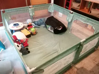 Parque infantil de tela y estructura metálica, ideal para que los más pequeños jueguen de forma segura. Color verde, medidas 185x155x65cm. No incluye juguetes