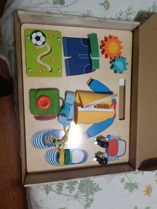 Tabla de actividades de madera para el desarrollo sensorial de los más pequeños. - Incluye elementos para abrochar y desabrochar. - Cuenta con un laberinto con pieza móvil. - Incorpora engranajes giratorios. - Presenta un zapato con cordones para practicar atar. - Tiene un cochecito con ruedas.