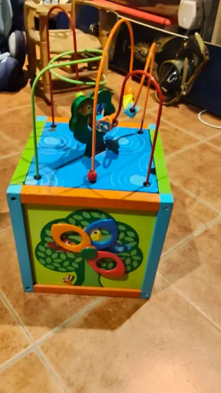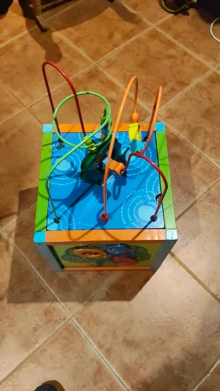 Caja de actividades para bebés. - Diseño colorido - Incluye laberinto de cuentas en la parte superior. - Paneles laterales con diferentes texturas y formas.