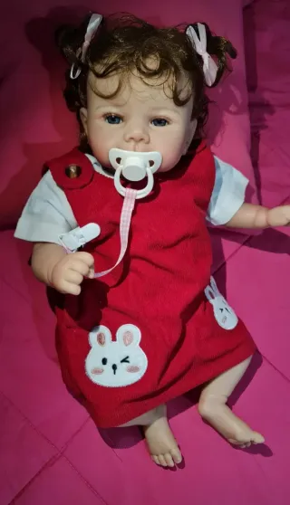 Vendo esta bonita bebé reborn de silicona de alta calidad en una sola pieza. Ojitos azules y pelito castaño enraizado. Boquita abierta para introducir chupete y/o biberón. Se incluye vestido con patucos de la foto, lazo para el pelo, y muda de body con gorrito y manoplas de mi elección. Regalo también pendientes, toallita rosa, pañal, biberón y chupete de goma. Longitud 45 cm y peso sobre 2,800 gramos. Envío en su preciosa caja de muñecas.