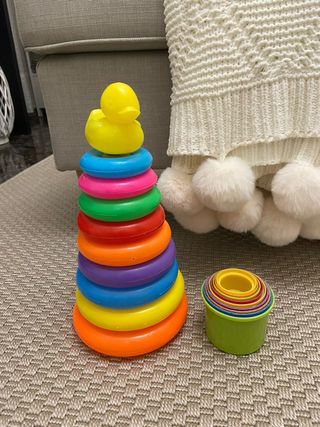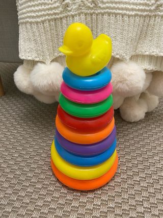Set de juguetes para bebés, ideales para el desarrollo de habilidades motoras finas y el reconocimiento de colores. Incluye una torre de anillas y vasos encajables. - Torre de anillas de colores. - Base con pato. - Vasos encajables de diferentes tamaños.