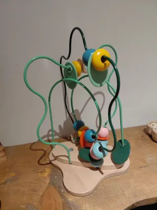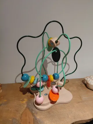Divertido juguete de madera con un laberinto de cuentas de colores para los más pequeños. Fomenta la motricidad fina y la coordinación. - Base de madera. - Alambre con cuentas de colores. - Tres laberintos Usado con algún rasguño, pero en buen estado.