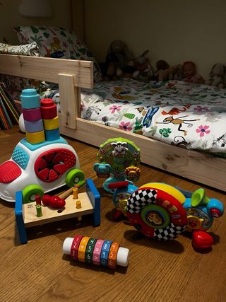 Conjunto de varios juguetes para bebés, ideales para el desarrollo temprano. Los juguetes estan como nuevos porque han sido poco utilizados - Juguete de apilar con bloques de colores. - Mesa de percusión con martillo y clavijas. - Juguete de arrastre con ruedas y actividades. - Rueda de números y operaciones matemáticas.