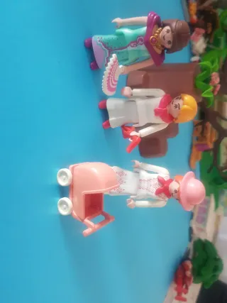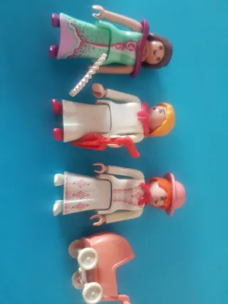 Conjunto de figuras Playmobil con accesorios casa victoriana - Incluye tres figuras de personajes. - Viene con un cochecito de bebé. - Accesorios como un paraguas y un peine.