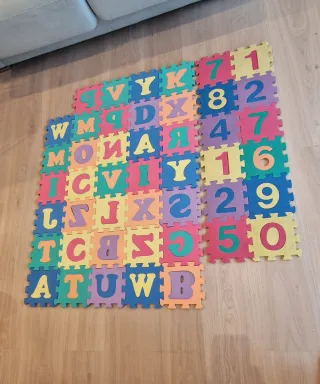 Alfombra de juego para bebés con piezas de letras y números. 46 piezas en total. - Piezas de colores. - Diseño de puzzle para que lo monte como quiera, haga palabras, o juegue con sus divertidos colores. - Ideal para poner en el suelo y quq esté calentito.