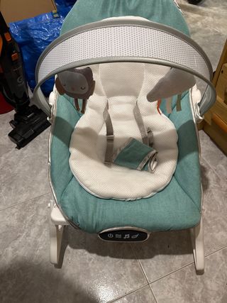 Hamaca para bebé en color verde menta, con un diseño moderno y cómodo. - Incluye un suave cojín. - Tiene un arco con juguetes colgantes. - Caja musical - Arnés de seguridad de 5 puntos. - Base con patas antideslizantes.