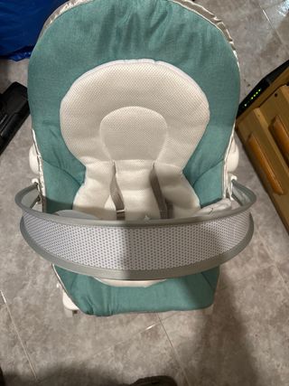Sillita de bebé en muy buenas condiciones, ideal para el descanso y entretenimiento del pequeño. - Color gris jaspeado. - Incluye capota protectora. - Arnés de seguridad. - Juguetes colgantes.
