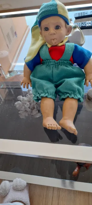 Muñeco duende con aspecto de bebé. Tiene pelo y pestañas. - Material blando al tacto. - Ropa de colores vivos.