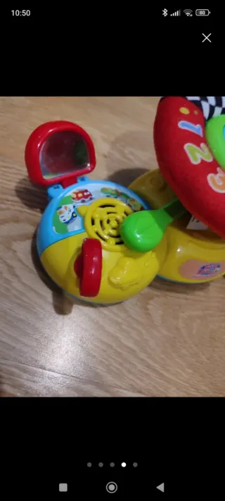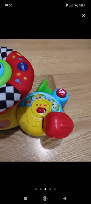 Volante de juguete interactivo de la marca Vtech. Ideal para los más pequeños. - Diseño colorido con diferentes texturas. - Botones con sonidos y luces. - Incluye un espejo para que el bebé se vea. - Se puede colocar en cualquier silla de paseo ya que se pega con velcro. - Enseña mediante canciones y sonidos de coche. - Tiene claxon, intermitentes, palanca de cambios, llave de arranque...
