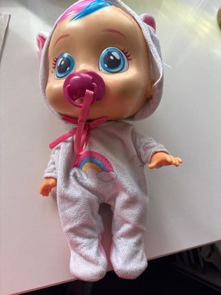 Muñeca de la popular serie Bebés Llorones. - Diseño colorido con traje morado y detalles rosas. - Cara con grandes ojos y expresión de sorpresa. - Pelo morado con mechones turquesa.