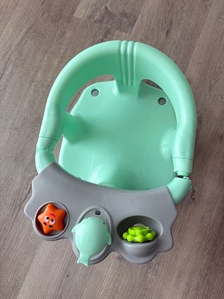 accesirio para bebé, en color verde menta y gris. Ideal para bañar a tu pequeño con comodidad y seguridad. - Asiento ergonómico y cómodo para el bebé. - Incluye juguetes de baño: estrella, ballena y alga marina. -la ballena ademas recoje agua y la escupe al hacer friccion hacia abajo. - Material plástico resistente y fácil de limpiar.