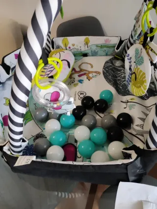 Manta de actividades versátil para bebés, con un diseño divertido y colorido. - Incluye arco de juegos con colgantes. - Base acolchada para mayor comodidad. - Viene con pelotas para jugar.