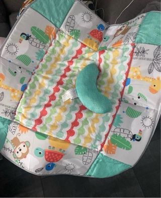 Manta de actividades para bebés con un diseño vibrante y entretenido. - Manta circular con diferentes secciones de colores. - Incluye un sonajero con forma de animal. - Cuenta con un espejo de seguridad en forma de flor. - Adornos de estrellas. - Material suave y acolchado.