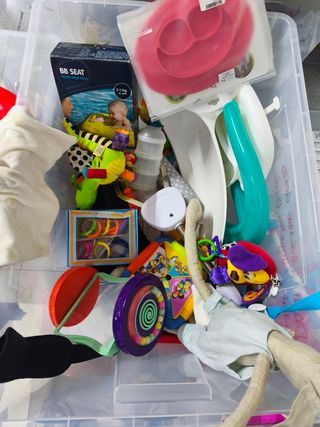 Lote variado de juguetes y accesorios para bebés. - Aro de gimnasio para bebé. - Peluche con sonajero. - Mordedores. - Asiento de baño. - Plato de silicona. - Juguete giratorio. -Flotador