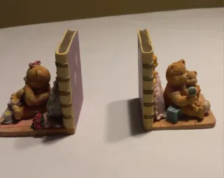 Set de dos sujetalibros con diseño infantil de ositos sentados junto a libros. - Cada sujetalibros tiene un libro morado como base. - Un sujetalibros muestra un osito con un lazo rosa y un plato. - El otro sujetalibros muestra un osito con un bebé osito y una pelota.