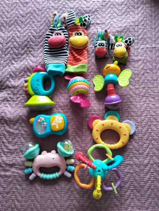 Conjunto de varios juguetes para bebés, ideales para estimular sus sentidos. - Incluye sonajeros con diferentes texturas y colores. - Peluches con diseños de animales. - Juguetes de agarre fácil para manos pequeñas.