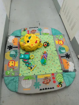 Gimnasio de actividades para bebés. Necesita ser limpiado - Incluye varios juguetes colgantes y una alfombra acolchada. - Estampados de animales y motivos selváticos.