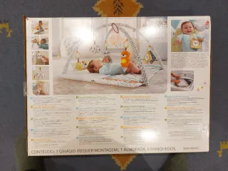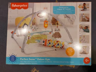 Gimnasio de actividades Fisher-Price Perfect Sense Deluxe Gym. - Diseñado para estimular los 5 sentidos del bebé. - Incluye un cojín de apoyo para la barriga. - Varios juguetes colgantes para el entretenimiento (falta el "libro") - Alfombra suave y cómoda para el juego.