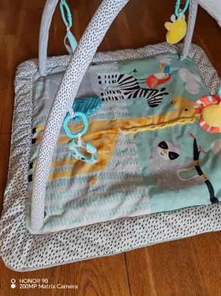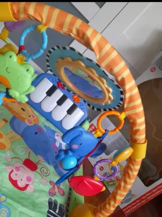 Gimnasio de actividades para bebés con un arco de juegos y varios juguetes colgantes, asi como un piano. - Diseño colorido con animales. - Base acolchada. El piano funxiona perfectamente. Poco uso, en buenas condiciones.