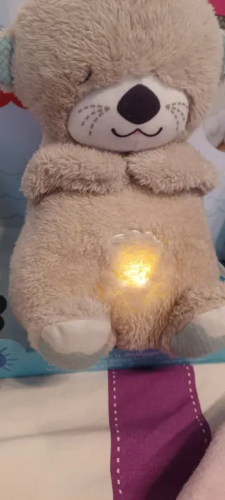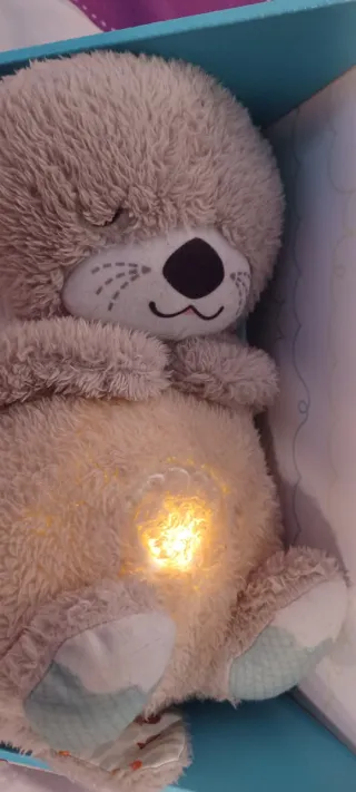Peluche suave y tierno de nutria, con funciones musicales y de luz. -Sonidos de la naturaleza, latidos del corazón. - Proyecta luz muy suave. - Melodías relajantes.