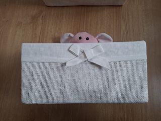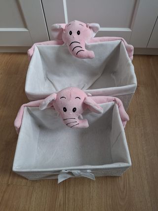 Preciosas cestas organizadoras para habitación infantil, perfectas para guardar juguetes o ropa. Son dos cestas con forma de caja, de color blanco roto con estampado de rejilla y un elefante rosa en cada una. - Ideales para la habitación de un bebé o niño pequeño. - Hechas de material textil resistente. - Decoradas con un lazo blanco. - Se venden juntas.